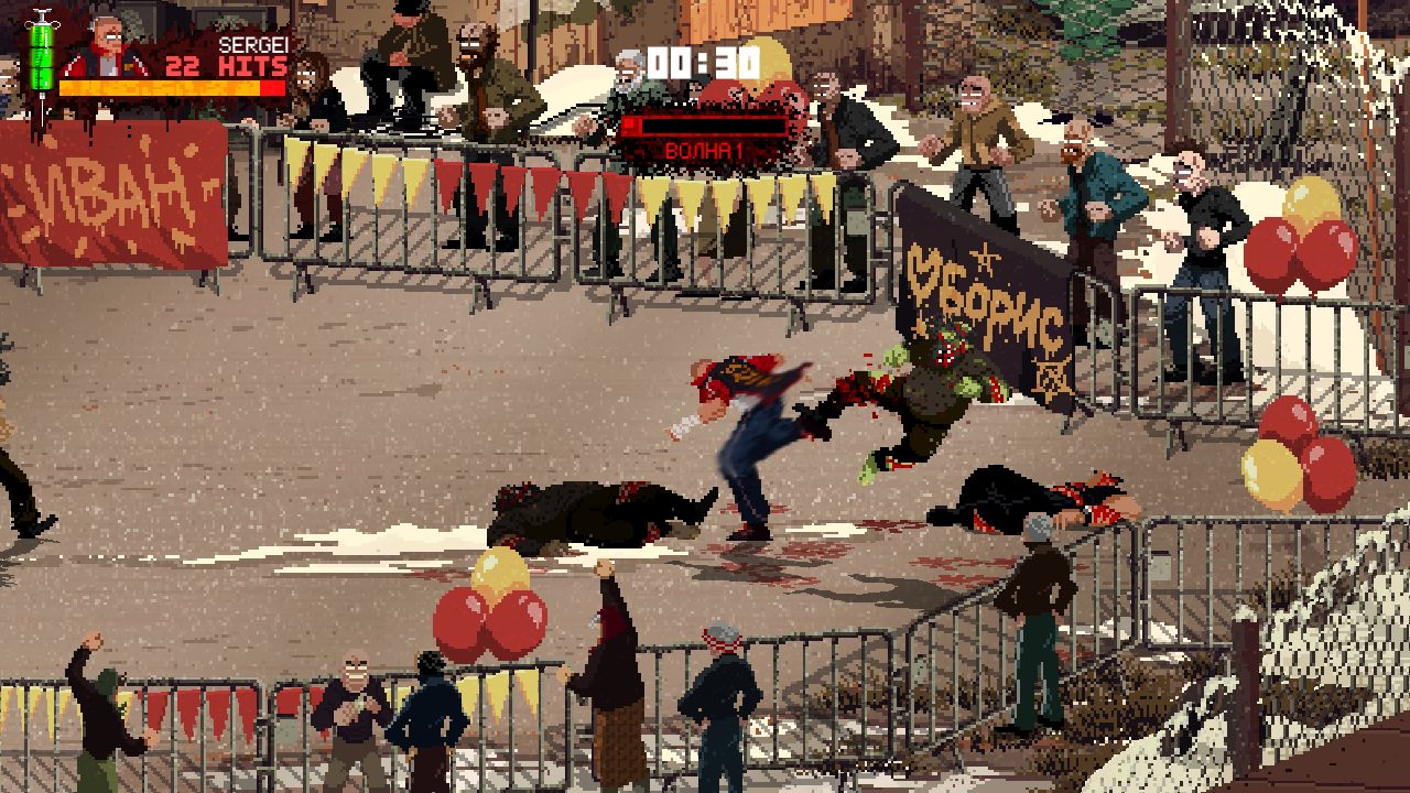 Mother Russia Bleeds – это простенькая аркада с очень необычным стилем и типом исполнения. Разработкой игры занималась компания Le Cartel, релиз состоялся в 2016 году. Перед нами типичный пиксельных инди-проект, который рассчитан на исключительно острые патриотические чувства и приступы любви к родине. Разработчики ничего нового не придумывали и взяли хорошо зарекомендовавший себя геймплей таких гигантов как Renegade, Double Dragon, Streets of Rage и так далее.